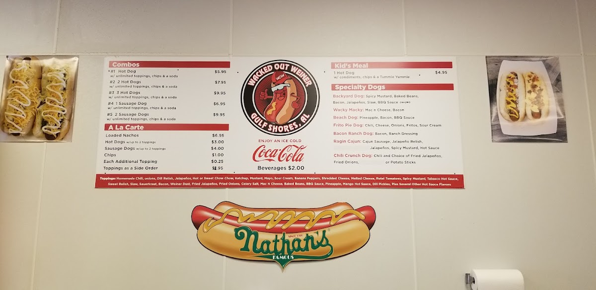 Welcome to Wacked Out Weiner Gulf Shores, where deliciousness meets creativity! Located at 3800 Gulf Shores Pkwy, this hot dog haven is all about indulgence with a twist. The menu proudly boasts a variety of combo meals, featuring their signature sausages and hot dogs that come with unlimited toppings, chips, and a drink, all starting at just $6.99!
